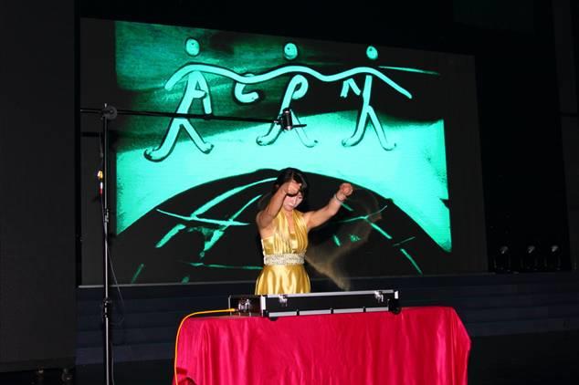 沙畫表演《艾的歷程》,在《Kiss the rain》的背景音樂下,主持人頌讀著旁白,表演者陳昱以灑、抹、擦、點、劃、漏、勾等各種手法在白色背景板上揮灑自如地繪制了八個惟妙惟肖的精美圖案,從開始的艾康生物字體,到斷橋風(fēng)光,小嫩芽,參天大樹,手拉手站在初生的太陽上和艾康Logo,艾成科技園圖案及最后的“傳遞健康、傳遞艾”字樣清晰地為大家描繪了艾康的成長史。