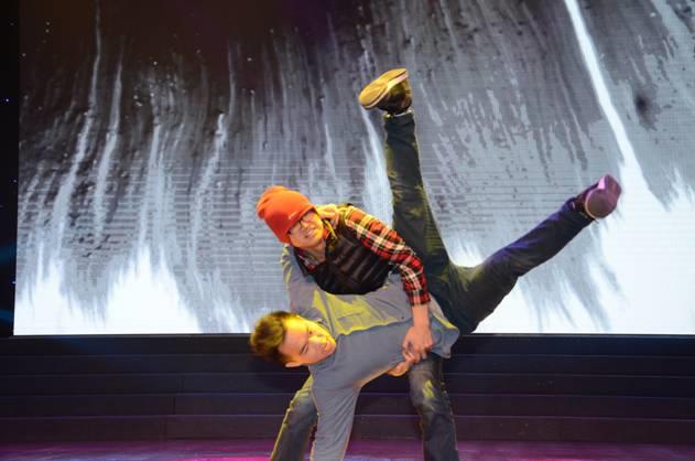 《動感秀》匯集艾集團(tuán)旗下的艾吉團(tuán)和輝圖兩個兄弟公司的智慧結(jié)晶,正是他們的親密合作才成功演繹了這個創(chuàng)意性強(qiáng)的精彩節(jié)目,它將雙節(jié)棍和街舞表演自然地串聯(lián)起來,在動感音樂《我就是李小龍》的伴奏下,艾吉團(tuán)曹樂平的表演動作矯健靈活,干凈利落,嫻熟地?fù)]舞著雙節(jié)棍,串接上輝圖二人的街舞表演,那是狂歡和自由的完美結(jié)合,他們用輕快的舞步,無限的激情,伴著強(qiáng)勁的節(jié)奏,舞動著身姿,舞動著青春,像活潑的精靈,活躍在舞臺中央。